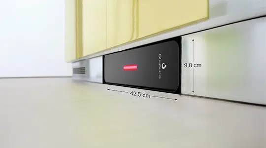 Es kann sowohl vertikal als auch horizontal installiert werden und passt sich leicht an jeden Raum an, selbst an kompakte Bereiche wie den Unterschrank oder die Sockelleiste.