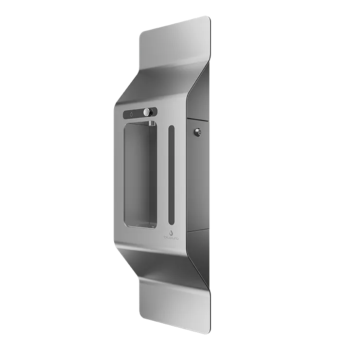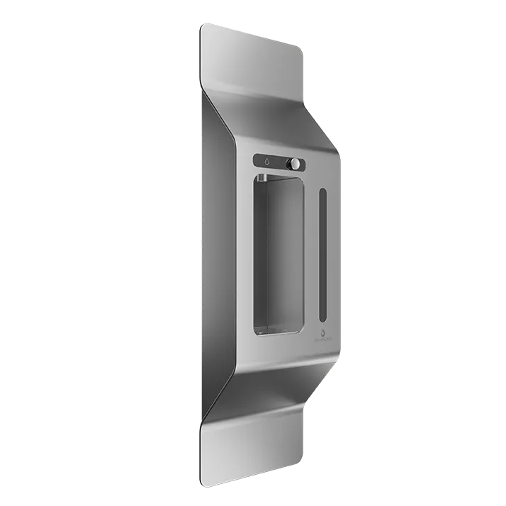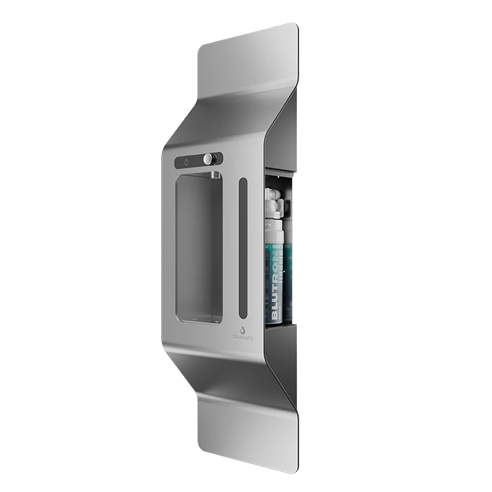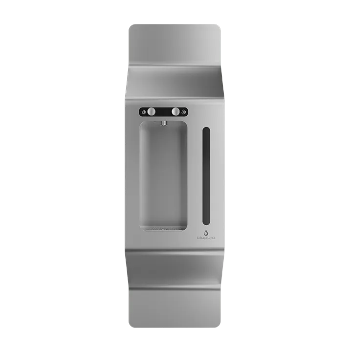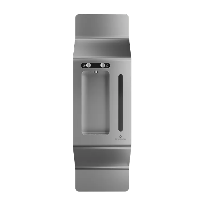 Manufactured from high-quality materials such as stainless steel and anodized aluminum, Wall Zero ensures robustness, hygiene, and long-lasting durability. The 1-button version dispenses ambient water and allows the filter to be integrated directly inside the unit. Compatible filters are exclusively Blutron Micro 7K, Blutron Shield 7K, and Blutron Hero 10K. The 2-button version dispenses ambient and cold or sparkling water, connecting to an external unit with the option of installing the filter upstream.