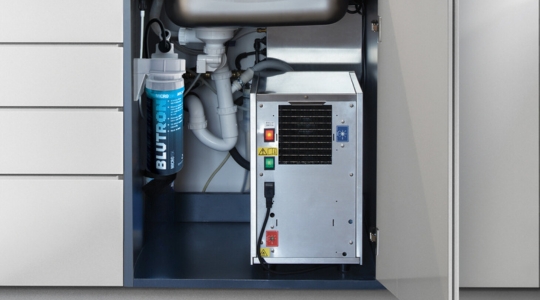 Depending on the type of system, Blutron filters can be installed directly inside the dispenser or on its exterior, for example in kitchen cabinetry, dispenser cabinets, or technical rooms. The mounting and replacement operations of the filters are made simple and quick thanks to the built-in connection at the top of the filter.