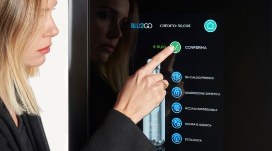 BLU2GO es la máquina dispensadora de agua de nueva generación, ahora oficialmente patentada en la Unión Europea y los Estados Unidos, que se conecta a la red de suministro y ofrece 4 tipos de agua en vaso o botella térmica. Con sus opciones de dispensación, servicio, tecnología avanzada y varios métodos de pago disponibles, BLU2GO es la solución líder que abre las puertas hacia un futuro eficiente en el sector de la venta de agua, reduciendo el uso de plástico. Además de dispensar agua, BLU2GO promueve el uso de botellas térmicas de agua reutilizables. Equipado con un gran dispensador interno (capacidad 40 unidades), BLU2GO comercializa en exclusiva el modelo Blupura Inox Bottle de 500 ml, que garantiza una gran calidad y rendimiento. Es posible personalizar la botella térmicas de agua. Además, BLU2GO permite lavar y desinfectar de forma eficaz y natural las botellas térmicas más comunes de acero inoxidable, vidrio, aluminio o plástico para alimentos. La máquina está equipada con una pantalla conforme a la norma ADA con un menú de fácil acceso para garantizar la accesibilidad de las personas con discapacidad. Por último, su diseño innovador ha sido reconocido y premiado con el iF Design Award 2023, uno de los galardones más prestigiosos a nivel mundial en el ámbito del diseño.
