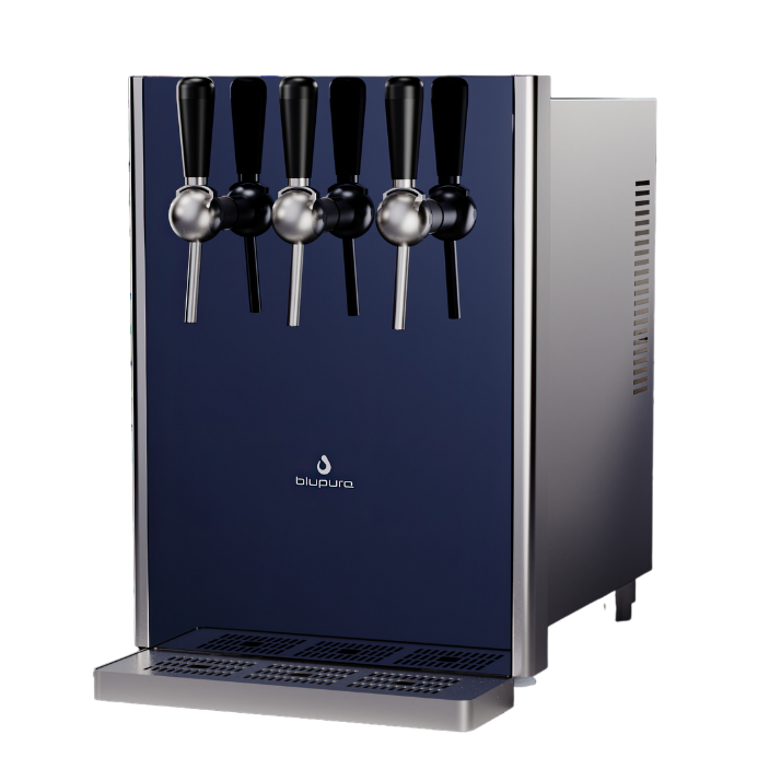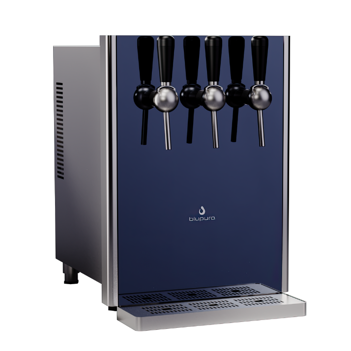 Bluglass 80 es el modelo ideal para quienes buscan una opción compacta, potente y elegante para garantizar un suministro importante y constante de agua de calidad en ambientes de restaurantes y oficinas. Con sus avanzadas prestaciones, este sistema ofrece un excelente rendimiento ocupando poco espacio. Además, el elegante diseño de Bluglass 80 encaja perfectamente en cualquier entorno, añadiendo un toque de estilo y sofisticación. Tanto para un local moderno como para un despacho profesional, Bluglass 80 es la elección ideal para satisfacer una amplia gama de requisitos. En la versión "Beer tap', Bluglass está equipado con grifos mecánicos manuales que permiten llenar varias botellas al mismo tiempo.