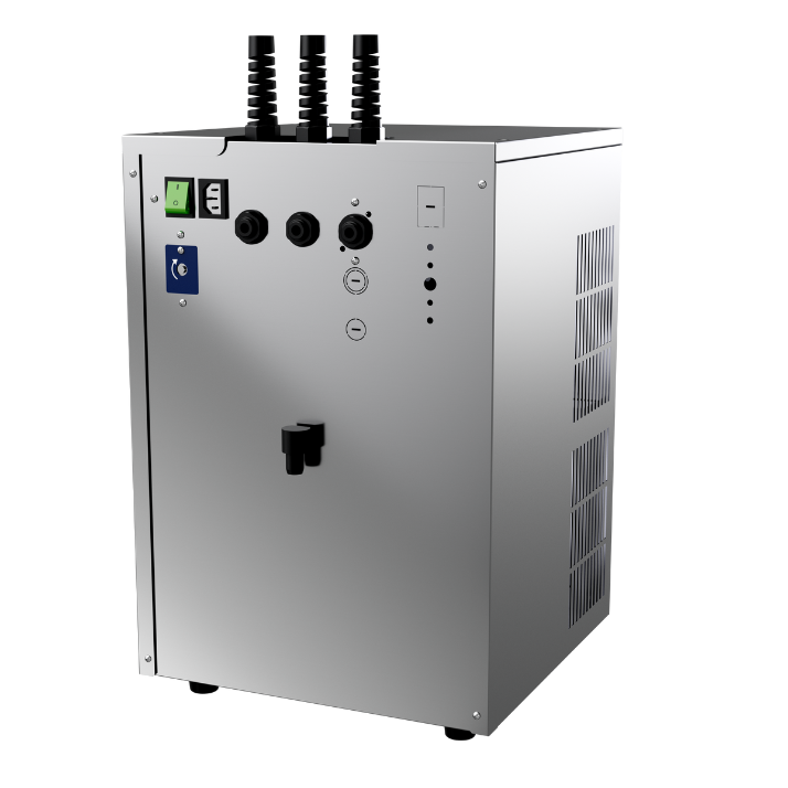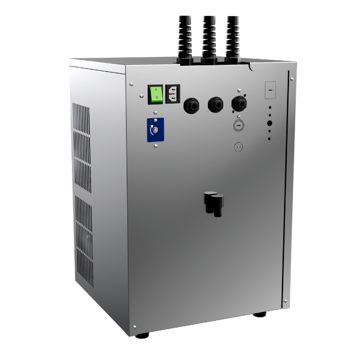 El bajo encimera que ofrece un suministro continuo de 18 litros de agua y puede combinarse con cualquier tipo de grifo. Está fabricado íntegramente en acero inoxidable y su interior es fácilmente inspeccionable. Las tres opciones de dispensación incluyen agua fría sin gas, agua a temperatura ambiente y agua con gas, mientras que la versión HOT ofrece agua caliente en lugar de agua a temperatura ambiente. El sistema está equipado con un gasificador profesional de acero inoxidable y una bomba de protección en caso de escasez de agua.