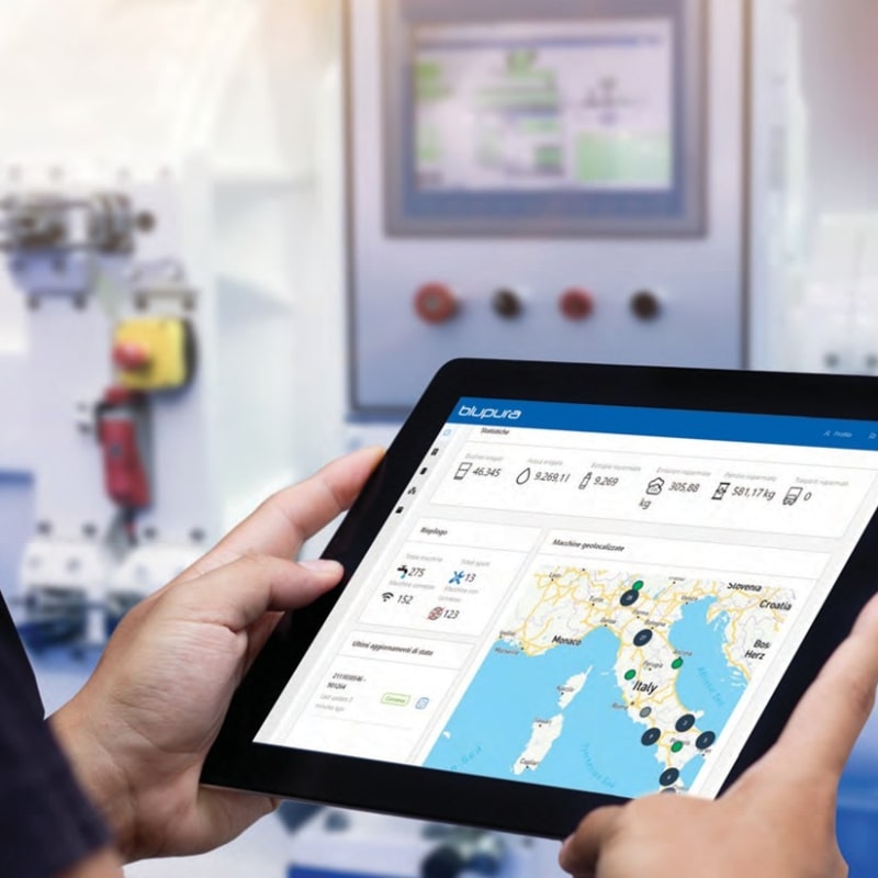 Blujuice et Bluglass Plus sont disponibles avec la technologie IoT en série. Les données relatives aux fonctions de blocage et redémarrage, aux litres fournis, à la consommation de CO2, à l’épuisement des lampes UV peuvent donc être contrôlés à distance, tandis que les paramètres de fonctionnement, les dosages et la température de l’eau peuvent être réglés.