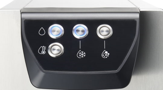 Acier inoxydable brossé, design compact, lignes arrondies, tête de distribution élégante en ABS. Les boutons lumineux en acier inoxydable de ROCK ne sont pas seulement beaux et robustes, mais grâce à l'éclairage à LED, ils indiquent aussi l'état de la fontaine.