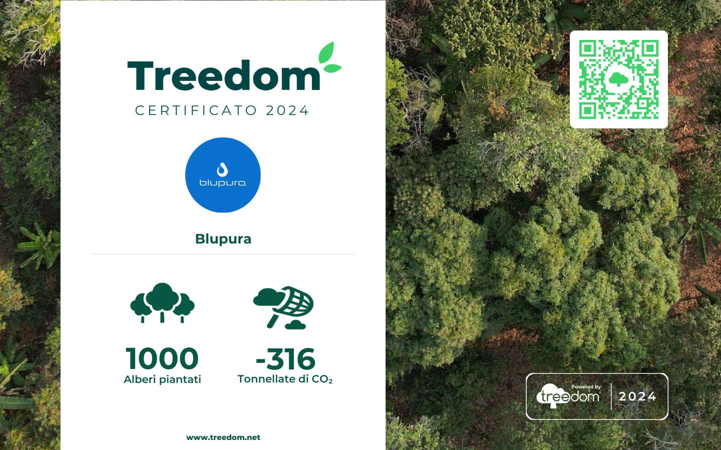 In collaborazione con Treedom, Blupura ha lanciato il progetto Blupura Greenwood, che prevede la piantumazione di 1.000 alberi nel 2024 ed altri 1.000 nel 2025 in paesi come Colombia, Ghana, Guatemala, Kenya e Madagascar. Questi alberi non solo aiuteranno a compensare le emissioni di CO₂, con una stima di circa 316 tonnellate assorbite ogni 1.000 alberi, ma porteranno anche benefici concreti alle comunità locali, fornendo risorse alimentari e opportunità economiche.