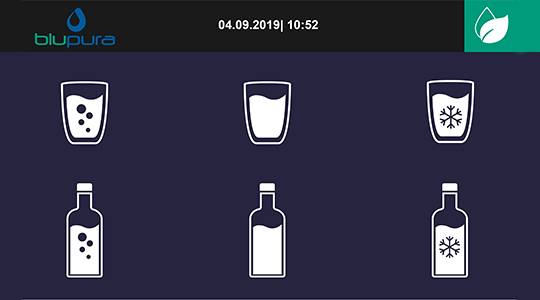 Bluglass Plus is the top of the range that expresses the utmost in cutting-edge design and technology, with a standard IoT system. Fully manageable through a 7” touch screen interface, it is used to view various types of information and parameters relating to the machine as well as to receive warnings on the absence of CO2 or filling of the drip tray. It is also possible to play personalised, informative or advertising videos during stand-by mode. It dispenses up to three types of water (cold, at room temperature and sparkling). It is also equipped with Portion Control and alarm in case of full drip tray.