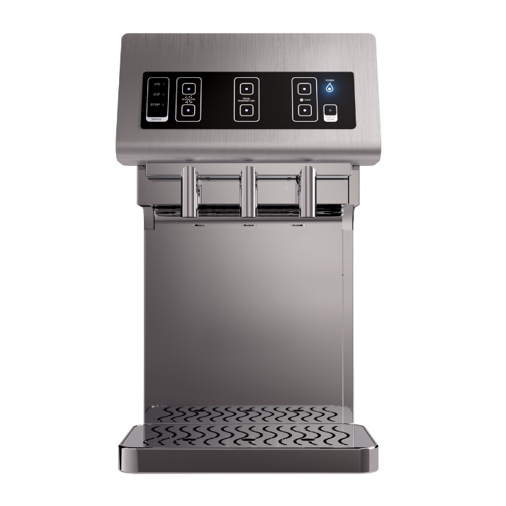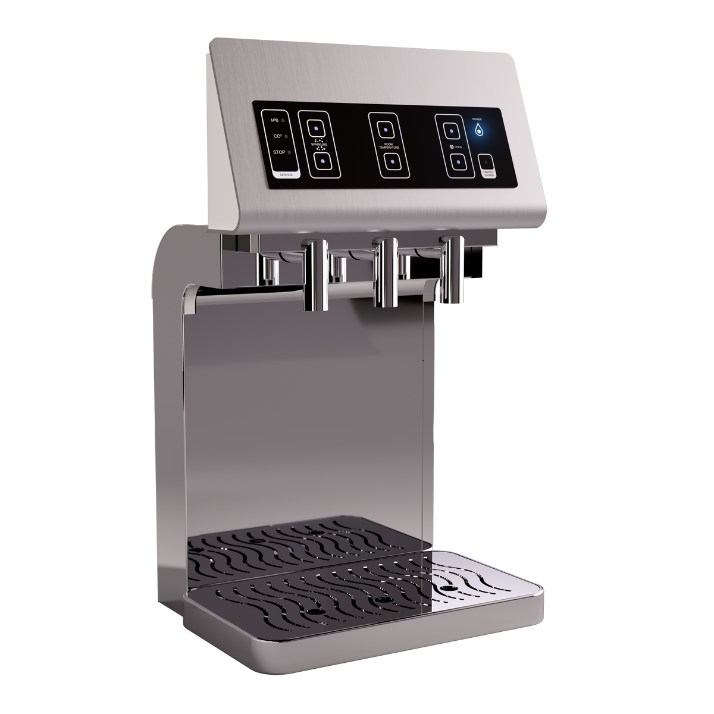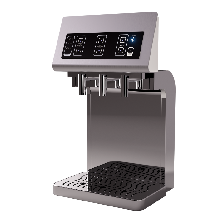 The revolutionary 3-way water dispensing head for each model of under-counter cooler, Fontemagna Bridge represents the choice of those seeking high performance, superior sturdiness and reliability in a single product. All in the smallest possible space. It is connected to the under-counter box, which can also be installed at a maximum distance of 6 metres, offering performance comparable to a large floor-standing cooler. The drip tray is standard.