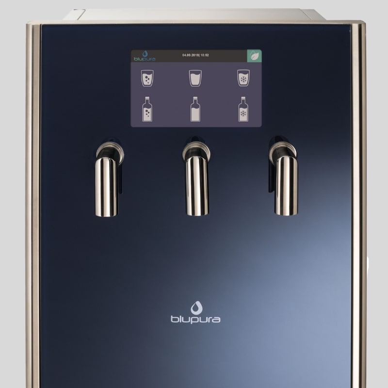 Bluglass Plus is the top of the range that expresses the utmost in cutting-edge design. Thanks to the 7'' touch screen, it is possible to view and manage various types of information and parameters relating to the machine as well as receive warnings on the absence of CO2 or filling of the drip tray. It is also possible to play personalised, informative or advertising videos during stand-by mode.